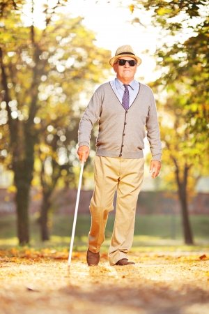 Full length portrait of a blind mature person holding a stick and walking in a park FREE
